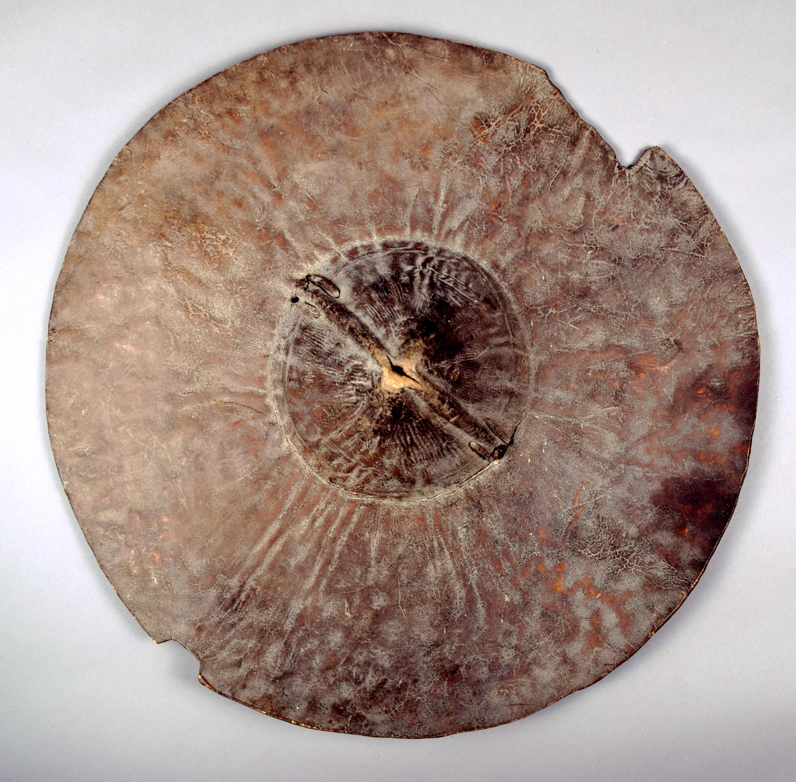 hide with a ridged central boss and cut outs from two sides and with a hide handle with cloth,