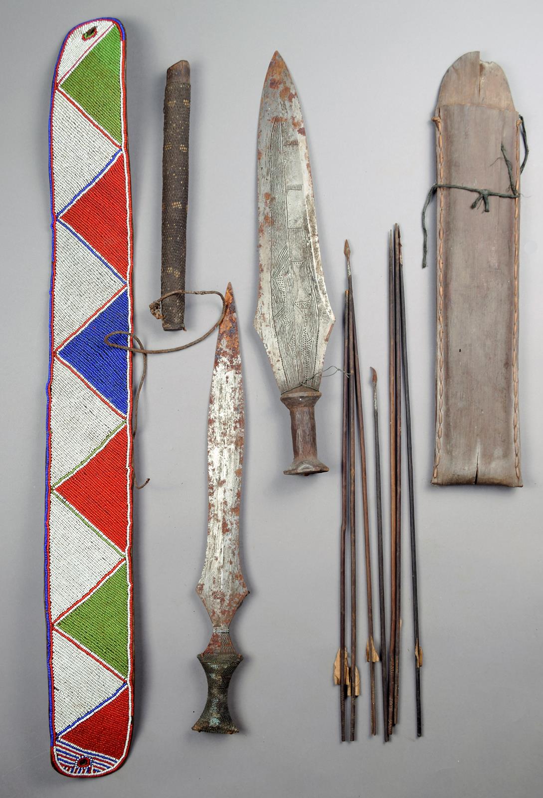 a quiver of metal tip arrows, a reptile skin covered sheath and a Kenyan beadwork waistband. (12)
