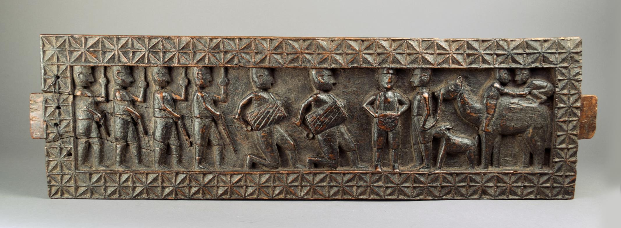 wood carved with musicans, a figure leading a horse with children on its back, the top with fifteen holes,