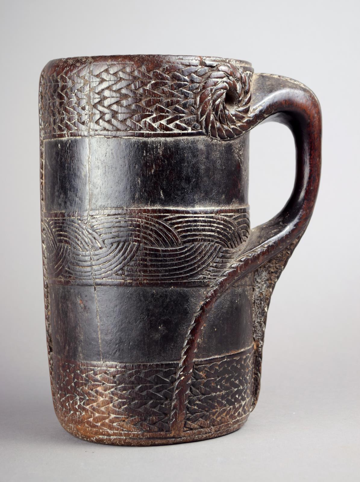 wood with three bands of carved decoration and a scroll and tendril handle,