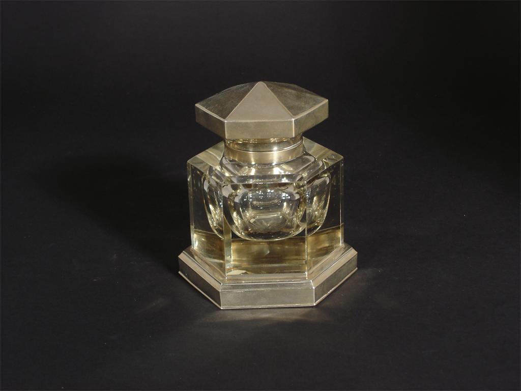 A Continental Art Deco silver and glass inkwell attributed to Gustave Keller, hexagonal section stamped 900 15cm. high
