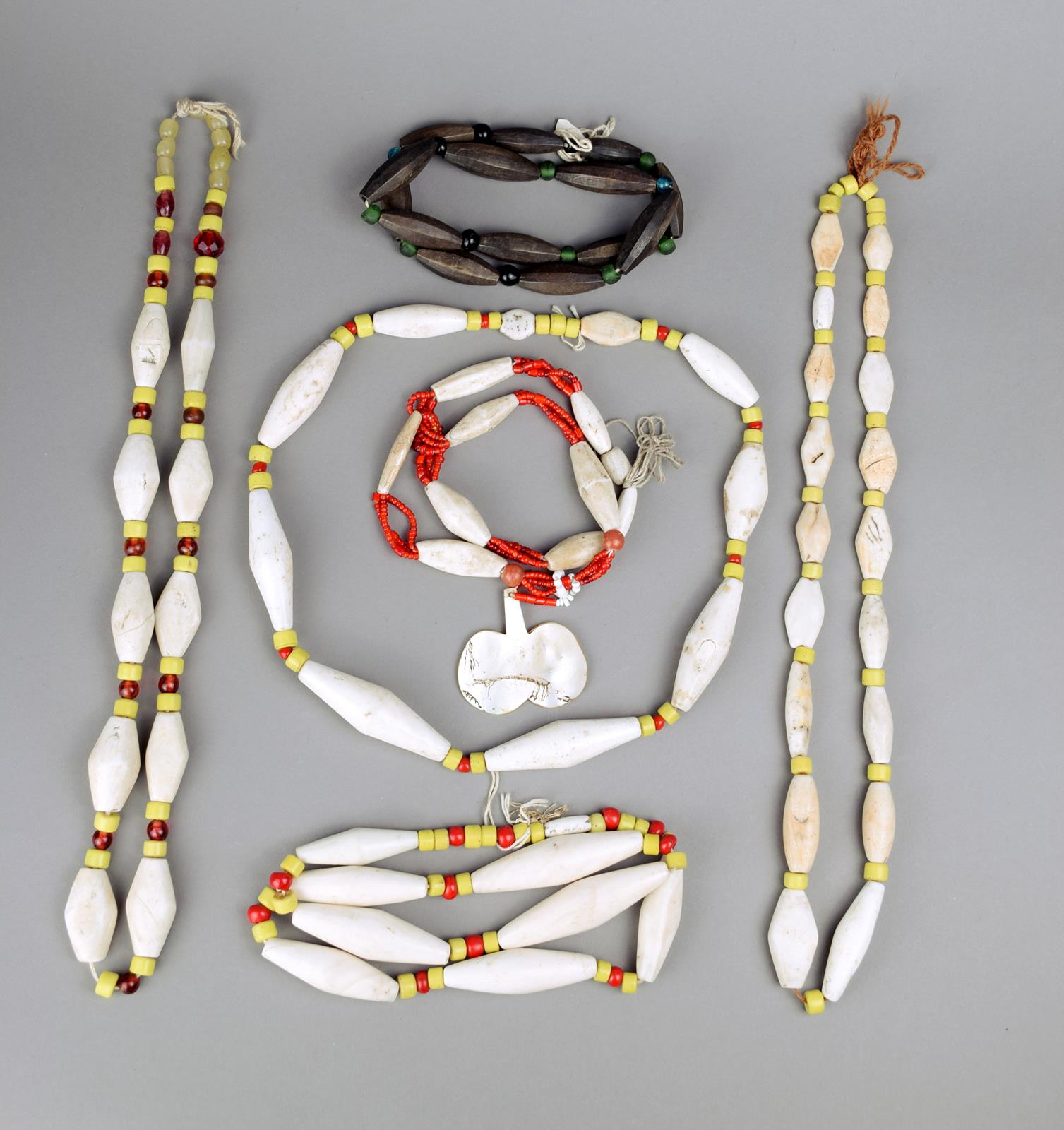 another with octagonal horn lozenge beads and glass beads and a sixth with shell and glass beads and with a mother of pearl pendant. (6)
