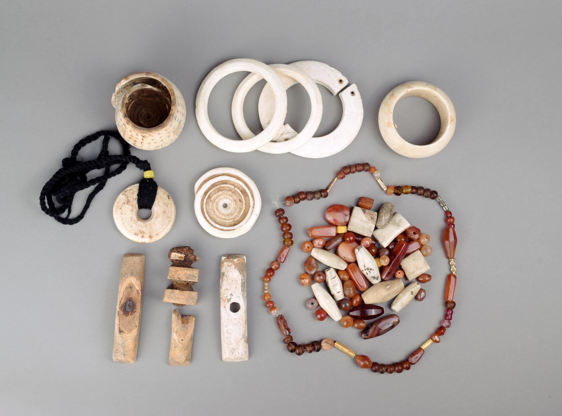 three shell disc pendants, a cone shell and various shell, agate and glass beads. (a lot)