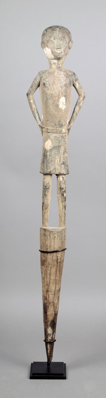 wood, modelled standing with hands on hips and wearing a skirt, on a pointed peg base,