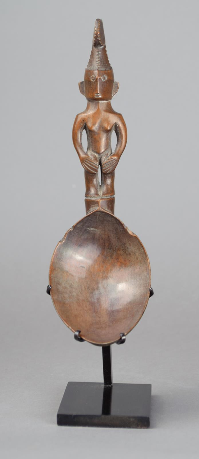 A Ifugao spoon Philippines wood with a standing female handle wearing a double circle headdress