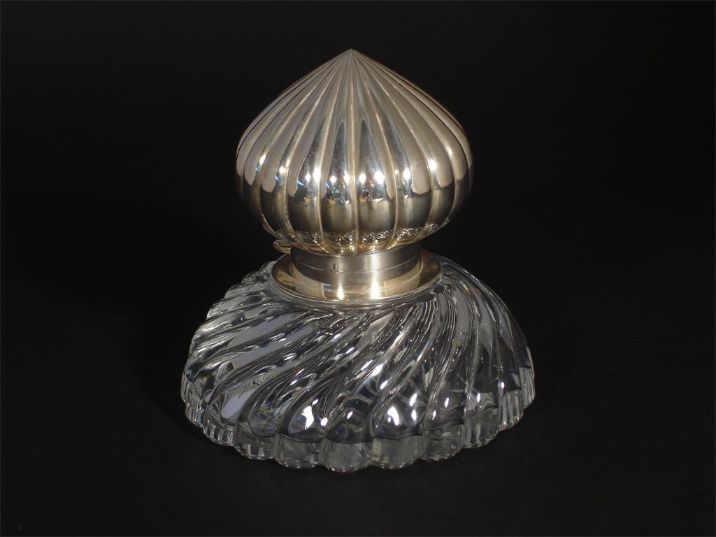 A large glass and white metal inkwell the glass of twisted fluted form