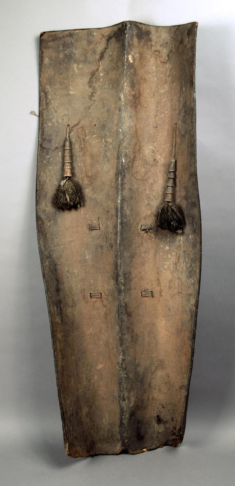 A Naga / Indonesian shield hide with two wooden and fibre pendants