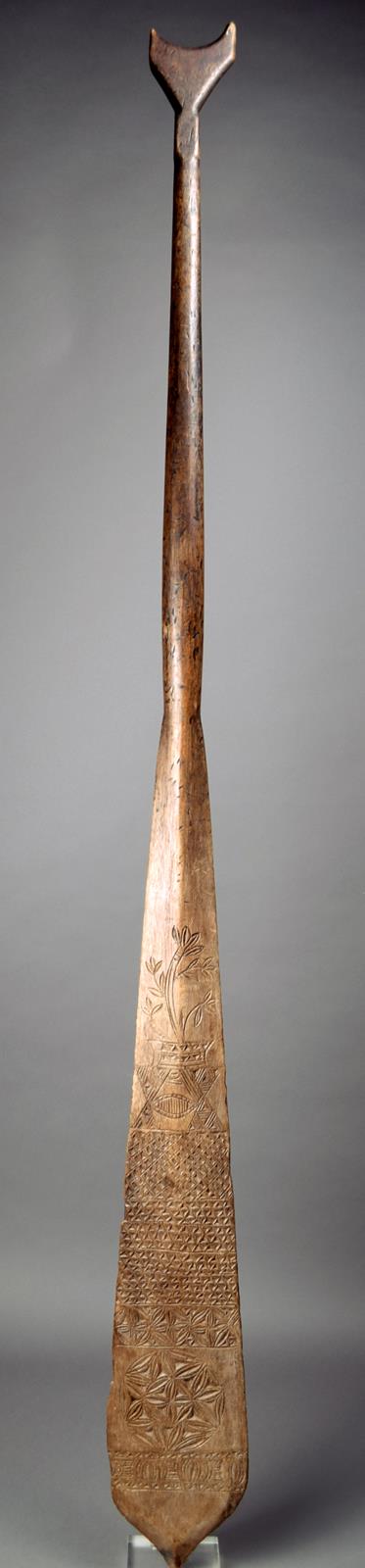 wood, with a pointed tip blade with carved geometric and foliage decoration, with a U shape terminal grip,