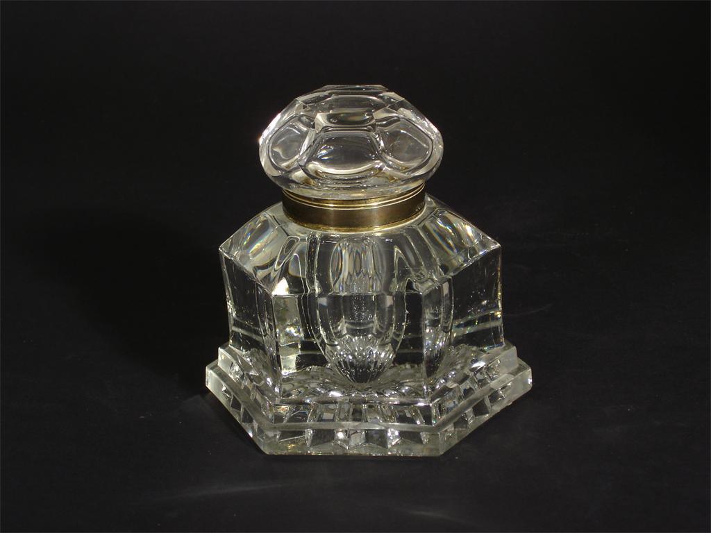 A hexagonal glass inkwell with faceted, circular glass hinged cover unmarked 14cm. high