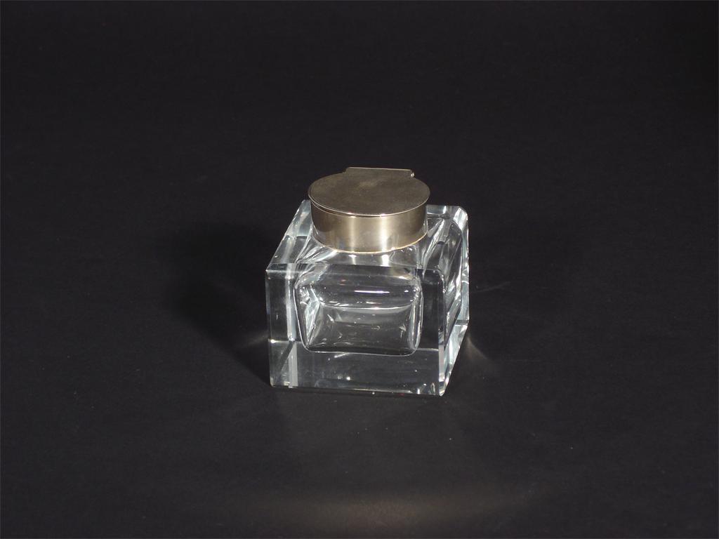 An Asprey & Co silver mounted glass inkwell the square glass body mounted with silver engine-turned flat circular cover stamped marks London 1939 6cm. wide