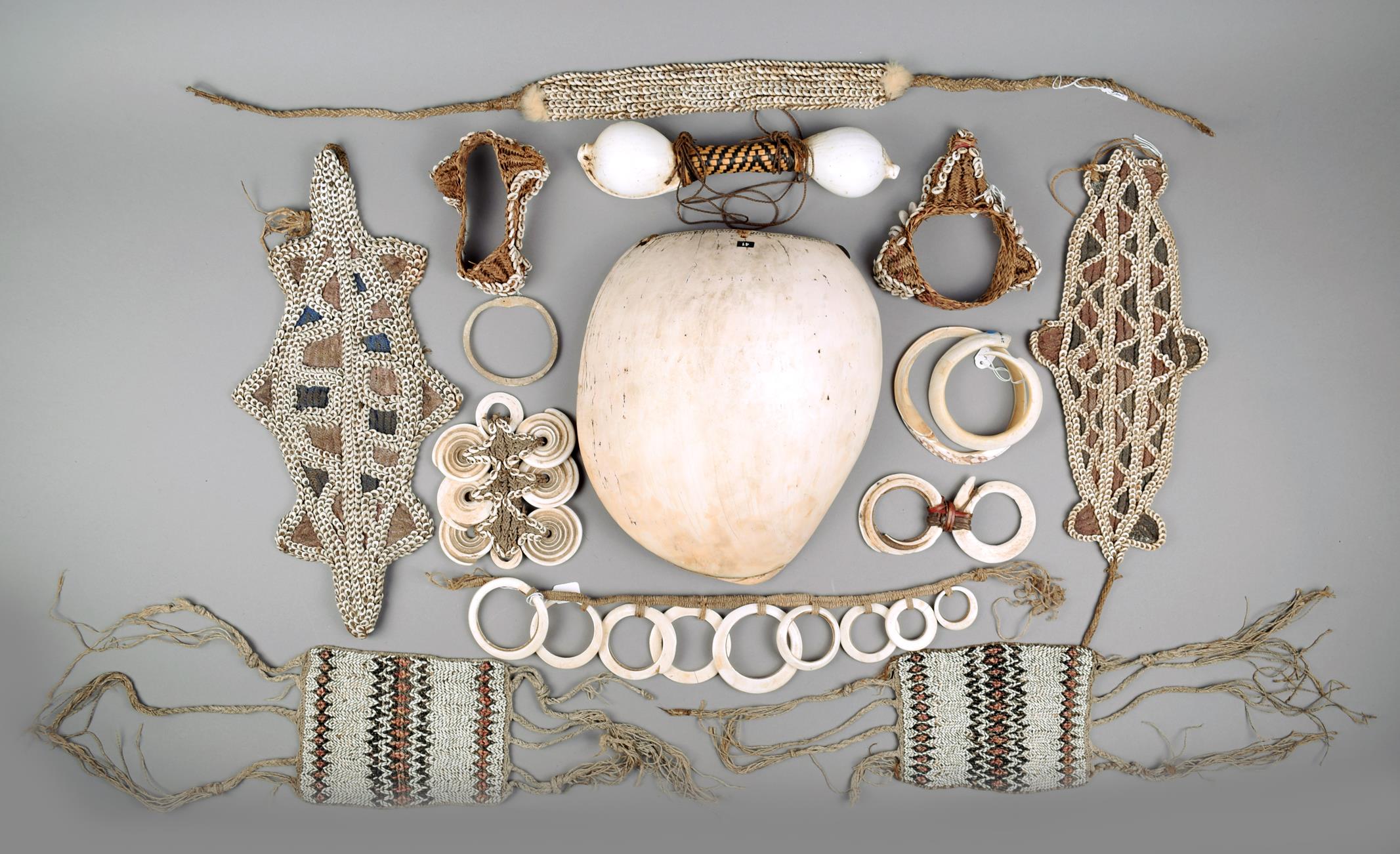 with a collection of Papua New Guinea ornaments including six shell and fibre armbands; two with geometric linear designs; two of stylized animal form with red and blue pigment; two as crocodile heads; a shell band with fur ends, a cluster shell ornament, a neck ornament with nine graduated shell discs, a Melanesia currency bar with two shell and woven fibre, a double shell ornament, two shell currency discs; one with fine incised decoration and a tusk ornament. (15)