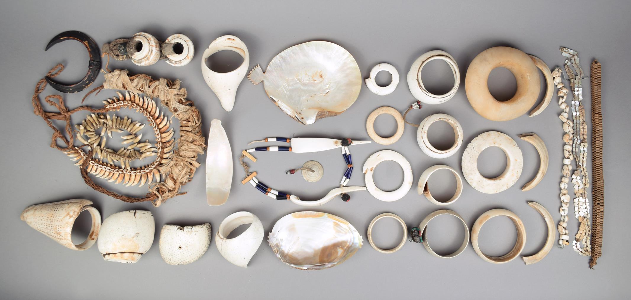 including armbands, one with pricked decoration and hung with beads, a necklace with beads and fibre, a spoon, a currency shell and a dish, together with boars' tusks, three animal teeth necklaces, and alabaster ring, plaited and plain hair.