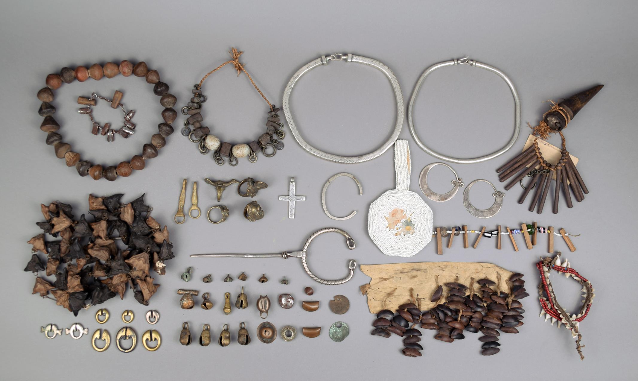 with a small collection of seed and glass bead necklaces, two silver coloured metal hoop earrings, four Ashanti brass rings, brass bells, a horn and wood charm, eight Philippines pendants and two silver coloured metal articulated necklaces.