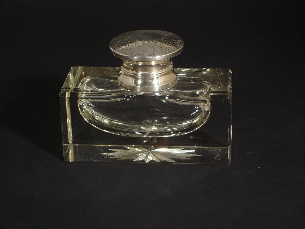 A silver mounted glass inkwell slender rectangular form, the hinged, circular cover engraved with flowers unmarked 13.5cm. wide