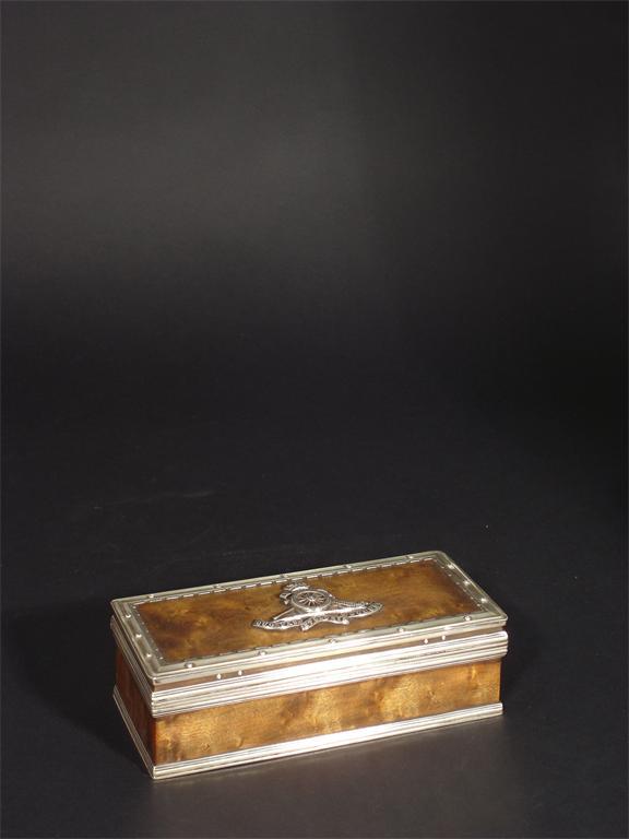 An Omar Ramsden silver mounted burr walnut Royal Artillery presentation casket rectangular form stamped marks, London 1937, Omar Ramsden Me Fecit17.5cm. wide