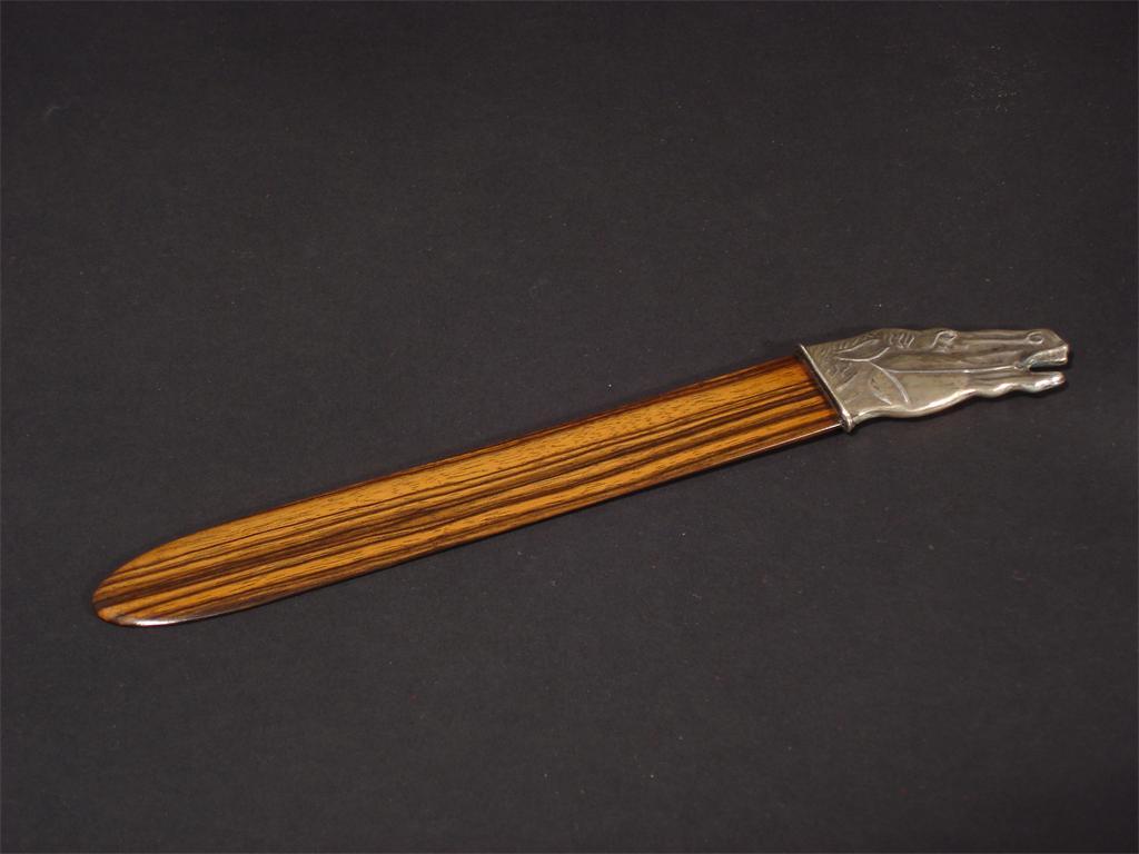 A white metal and maccasar wood paperknife the finial modelled as a horse head unmarked 26cm. wide