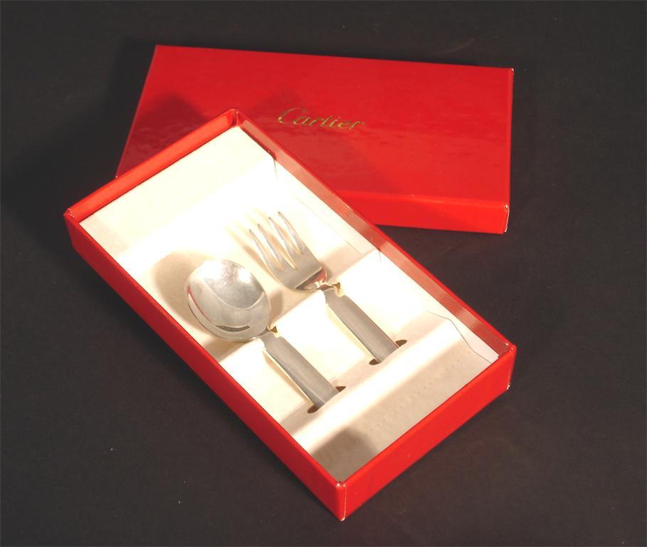 A modern Cartier silver christening fork and spoon set in Cartier presentation box stamped marks...