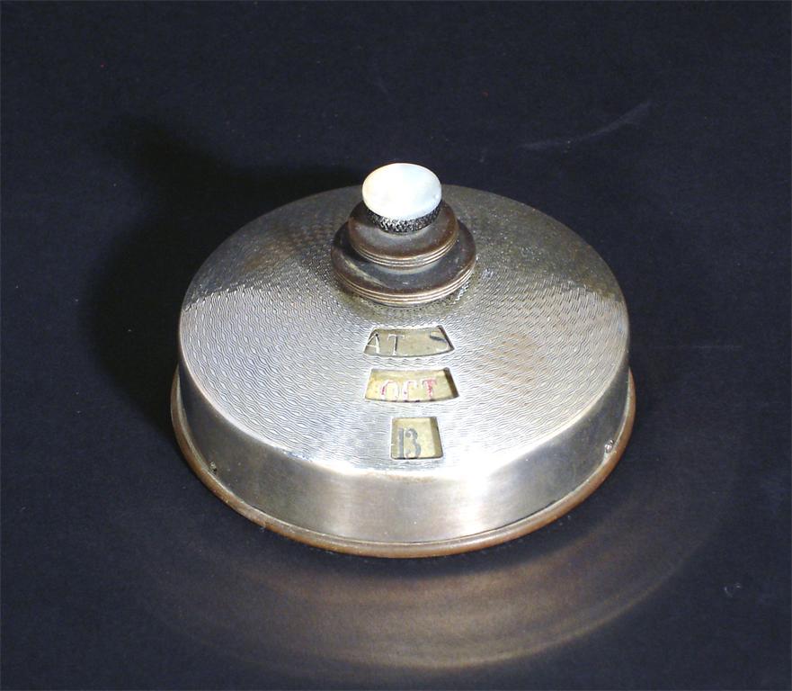 A silver perpetual calendar modelled as a bell push, with engine turned decoration stamped marks P&Bltd 1930 8cm. diam.