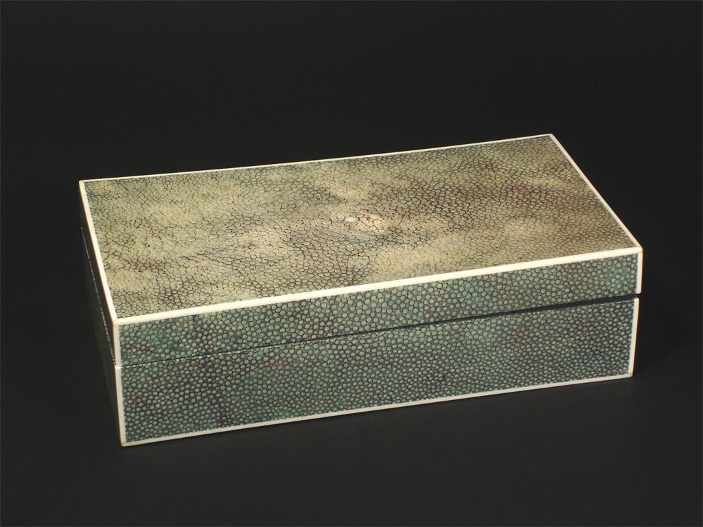A shagreen mounted sycamore gaming box with hinged cover and inset with ivory beading