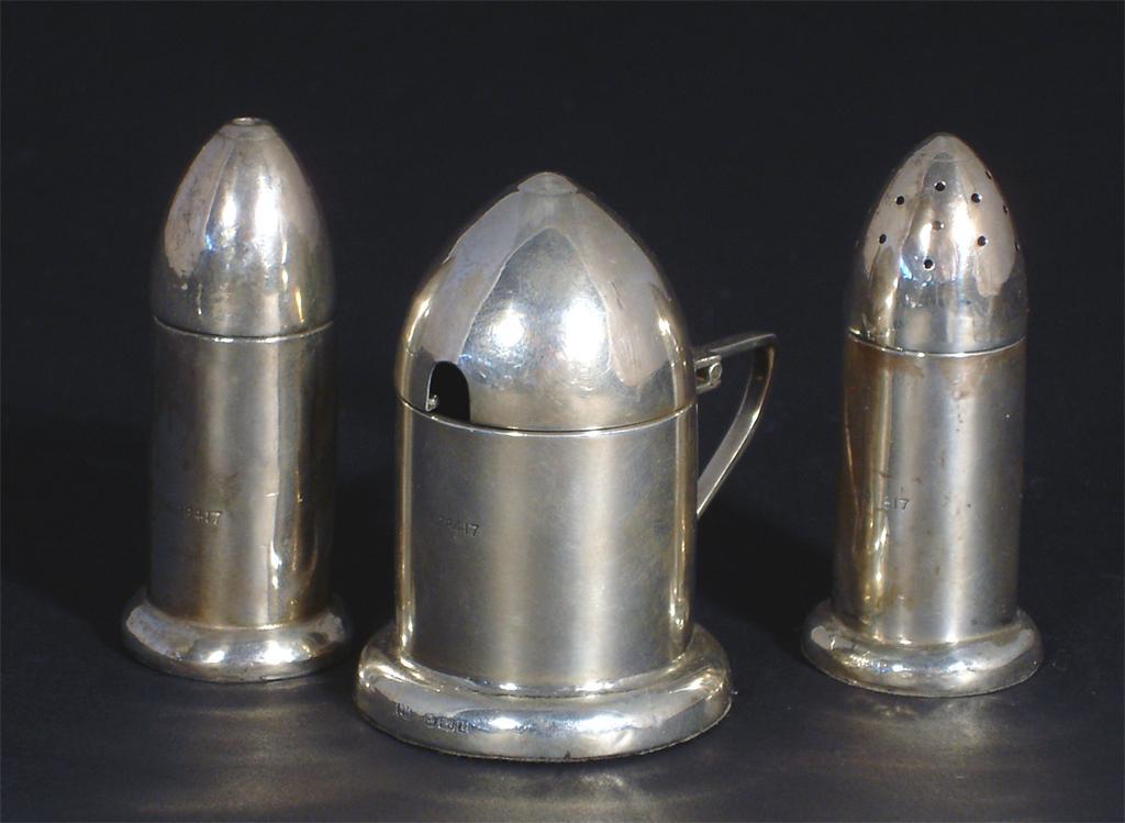 A T Wilkinson silver novelty cruet set each modelled as an artillery shell