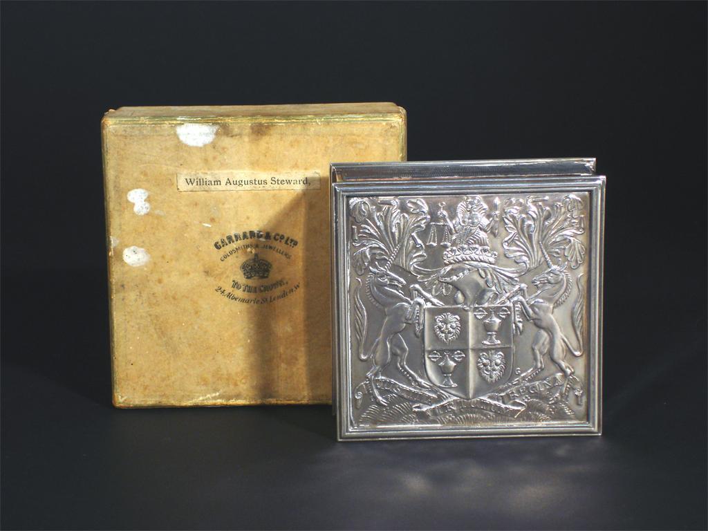 A Garrard & Co commemorative silver cigarette box commemorating the 600th Anniversary of the Goldsmiths Company's first charter 1327-1927, given by the Goldsmiths Company to William Augustus Steward, cast in low relief with coat of arms, in original presentation box inscribed inside cover, stamped marks SG London 1926 9cm. wide