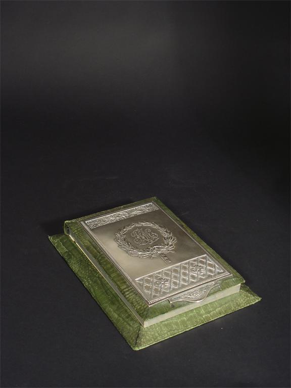 A Faberge silver mounted crocodile skin desk jotter rectangular form, the cover cast in low relief with a ribbon tied laurel wreath stamped marks 22cm. wide
