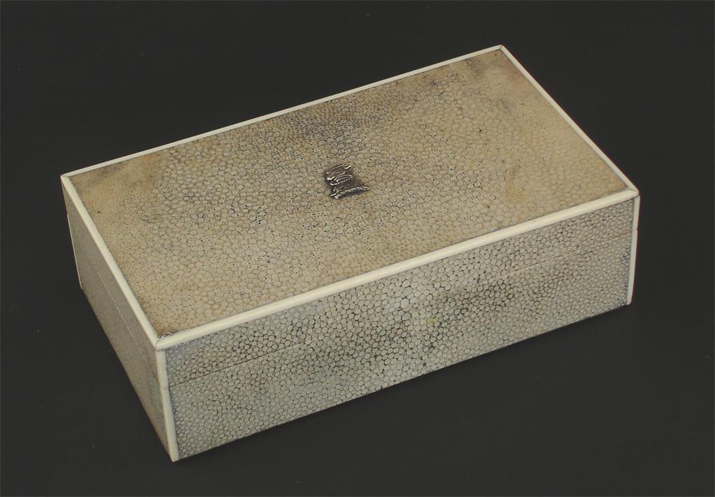 An ivory strung shagreen and cedar wood cigar/cigarette box rectangular section with hinged cover, the cover set with heraldic beast unmarked 18cm. wide