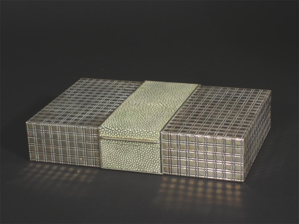 A Continental white metal and shagreen cigar box rectangular with hinged cover and cedar lining...