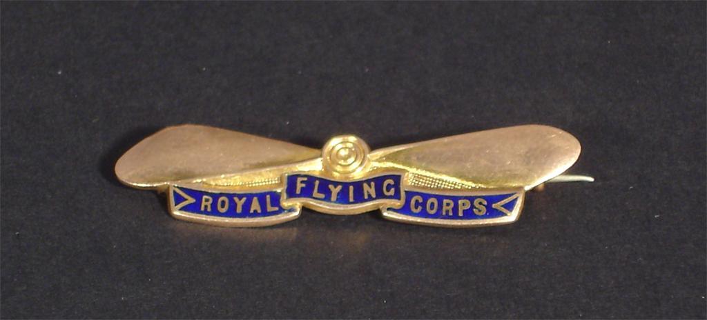 'Royal Flying Corps' an enamelled gold lapel badge modelled as a propeller blade stamped 9ct...