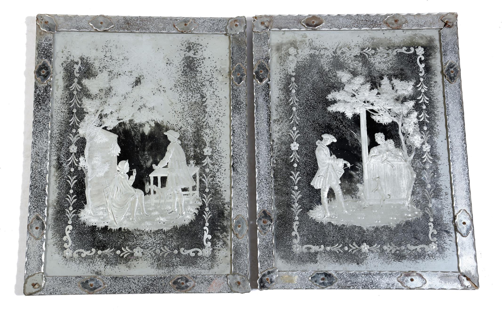 A pair of Italian Venetian wall mirrors, each with a rectangular plate etched with country scenes, one with a drummer with two ladies and their dogs, the other with two huntsmen, one seated smoking, the other drinking with his hound, the panels possibly late 18th century, later mounted, 49.2 x 37.1cm. (2)