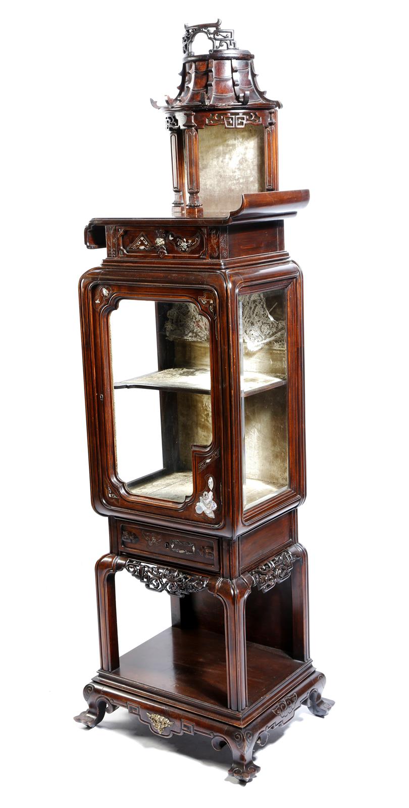 A French stained beechwood 'Japonais' display cabinet in the manner of Gabriel Viardot, inlaid with mother of pearl, the pagoda top above a glazed door enclosing a plush lined interior, above an open base of pierced carved decoration, 142.3cm high, 56.6cm wide, 44.5cm deep.