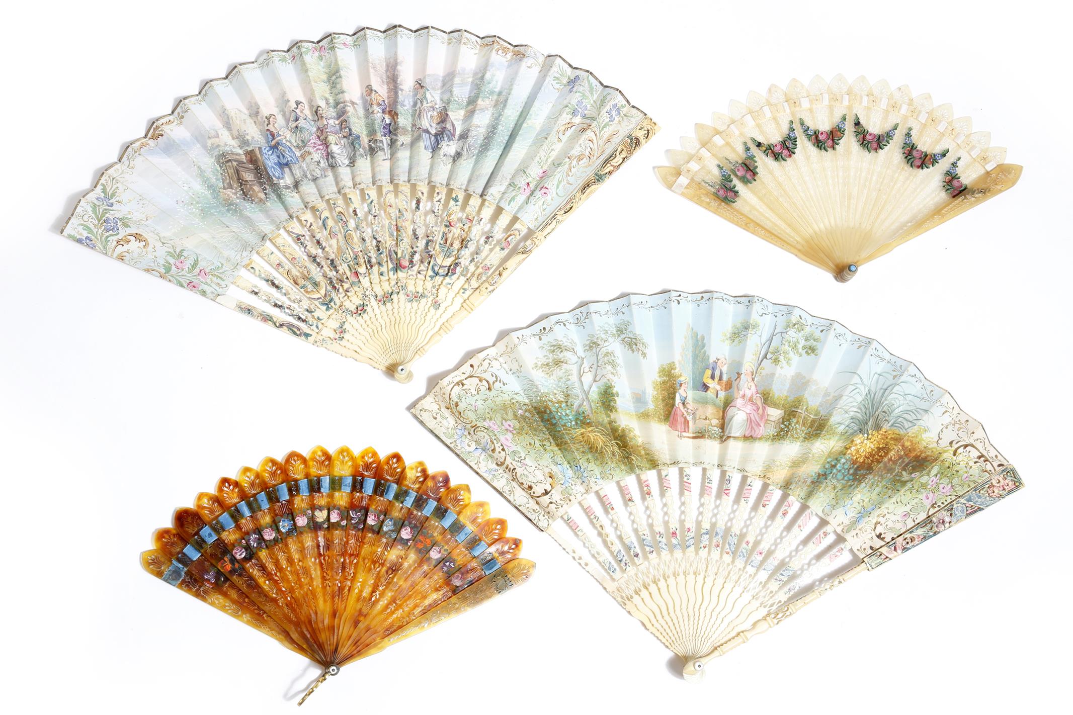 λ A 19th century Italian fan, with carved and polychrome decorated ivory guards and sticks, the fan painted with a family and a bird in a landscape, together with a similar fan printed and painted with country figures beside a lake with sheep and a dog, a horn fan with swags of flowers and a similar tortoiseshell example, together with a Maximillien fan box, 44.3cm wide (max). (5)