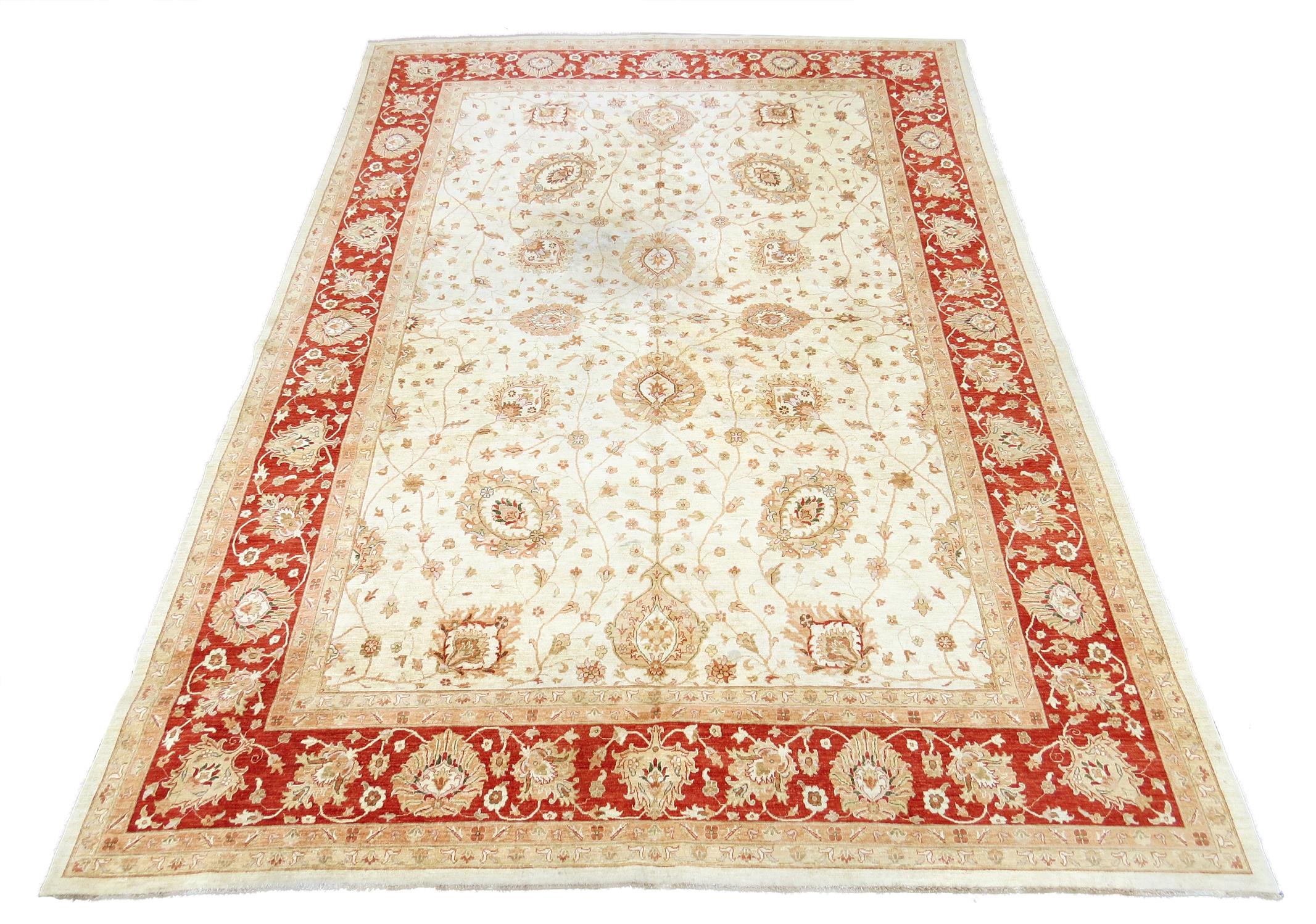 A large Persian style carpet, with an ivory ground and red borders, decorated with scrolling leaves and flowers, modern, 541 x 397cm.
