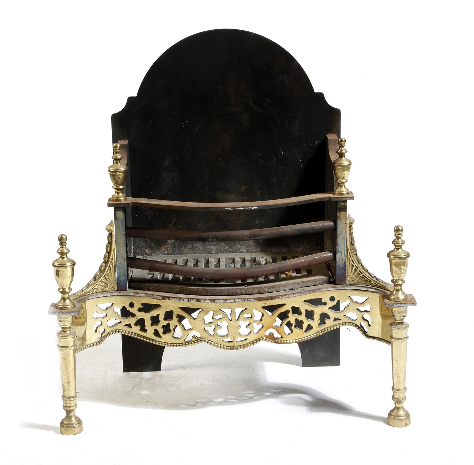 A George III style brass and cast iron fire-grate, with an arched back above a rail front and a pierced frieze, with turned urn finials, early 20th century, 71.7cm high, 66.2cm wide, 36cm deep.