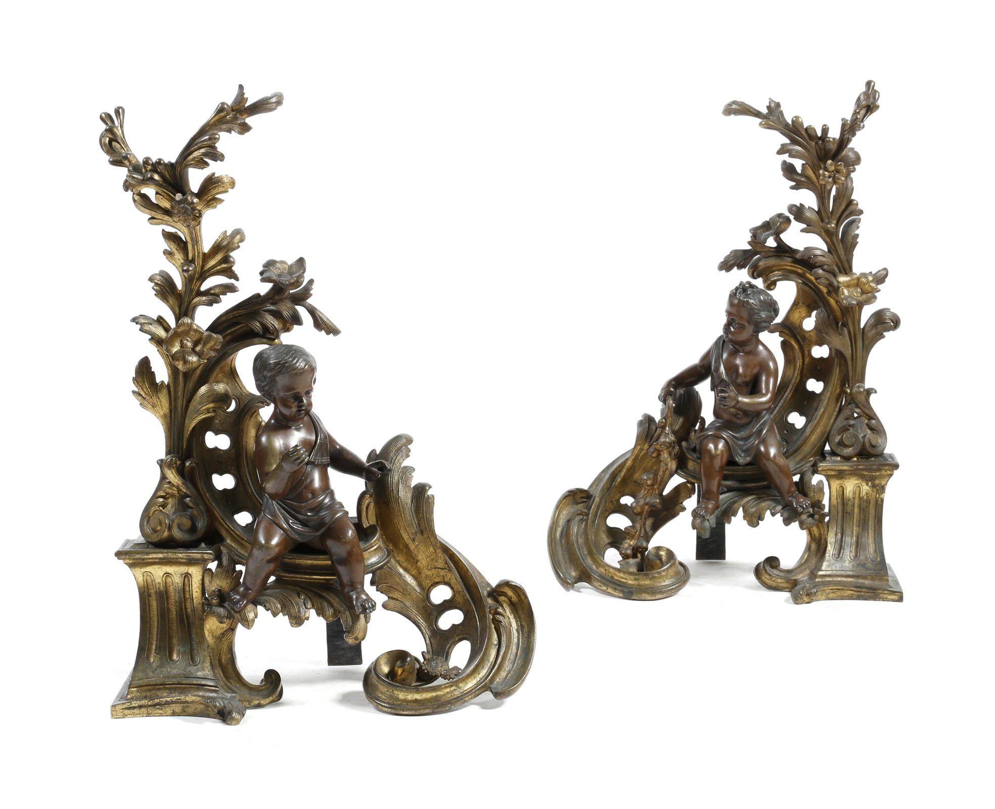 A pair of Louis XV style gilt and patinated bronze chenets, each modelled with a cherub, with scrolling leaves and flowers, 19th century, 54.5cm high, 39cm wide (2).
