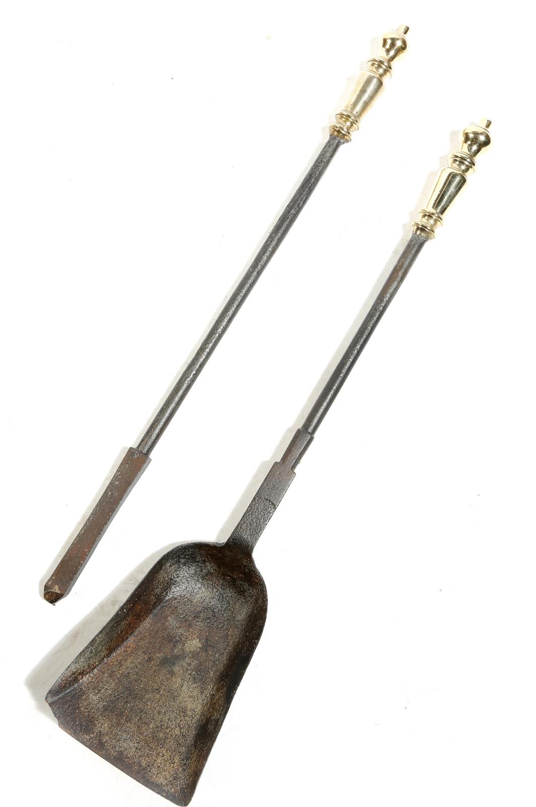 A large pair of George III iron fire tools, each with a turned brass handle, comprising: a poker and a shovel, 92.9cm long (max). (2)