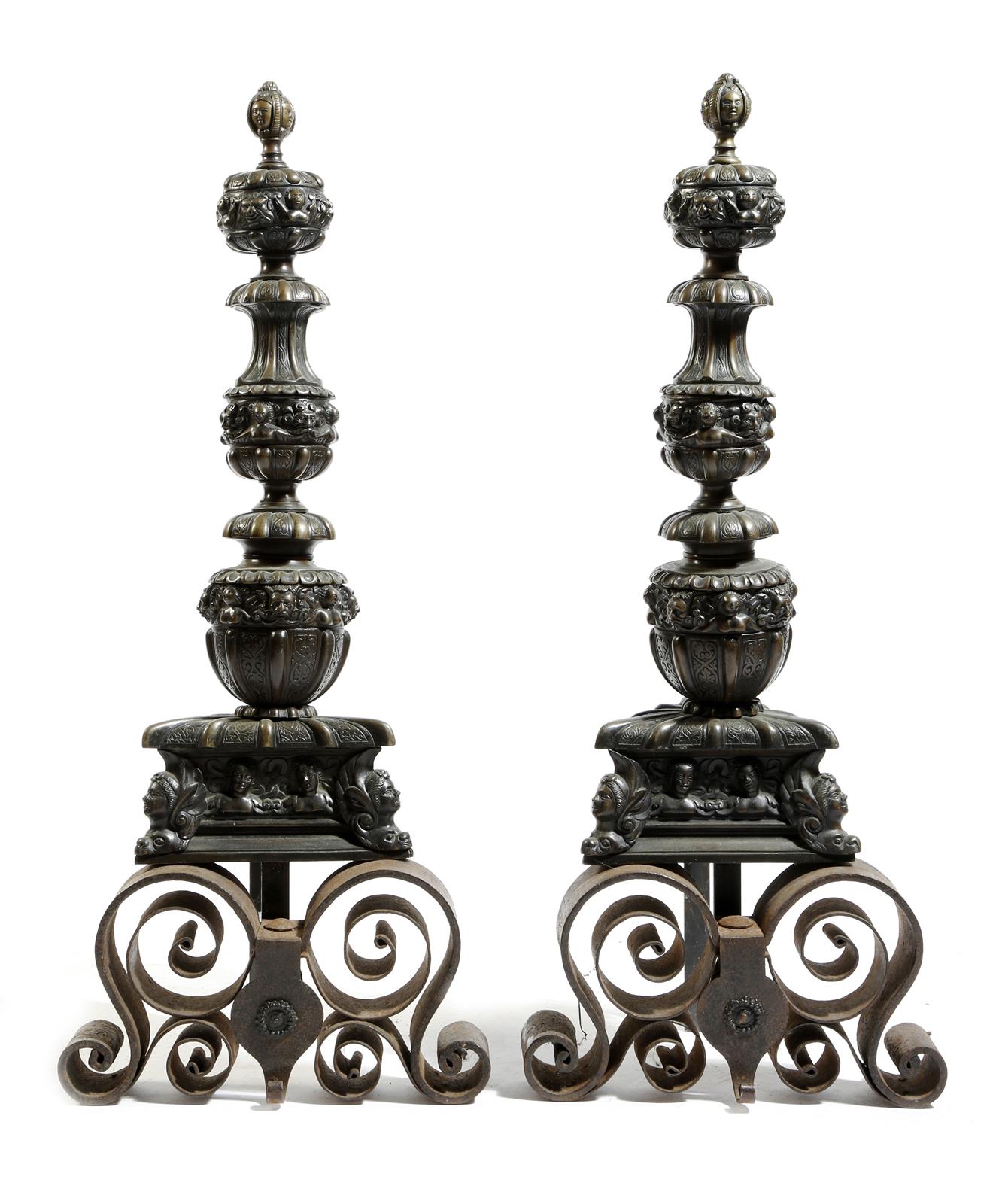 A pair of Italian bronze andirons in Renaissance style, the stems decorated with female and beast masks, on a triform base and a wrought iron scroll stand, 19th century, 88.9cm high, 36.2cm wide, 25.5cm deep. (2)