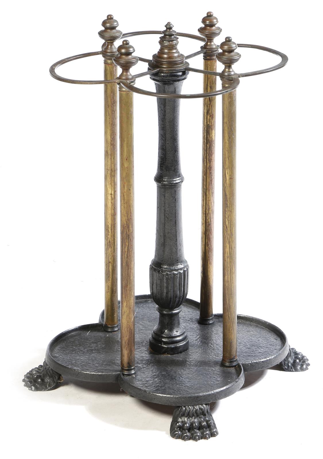 A Victorian brass and cast iron stickstand, with four divisions, a turned stem and four paw feet, 64.9cm high, 41.3cm wide, 40.5cm deep.