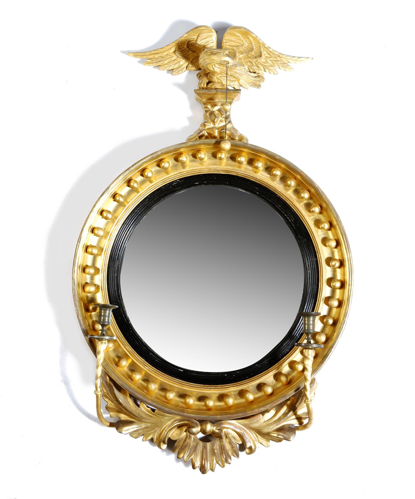 A Regency giltwood convex wall mirror, the circular plate within and ebonised slip and a ball decorated frame, with an eagle and ball surmount, the leaf base with a pair of brass sconces, 105 x 63.8cm.