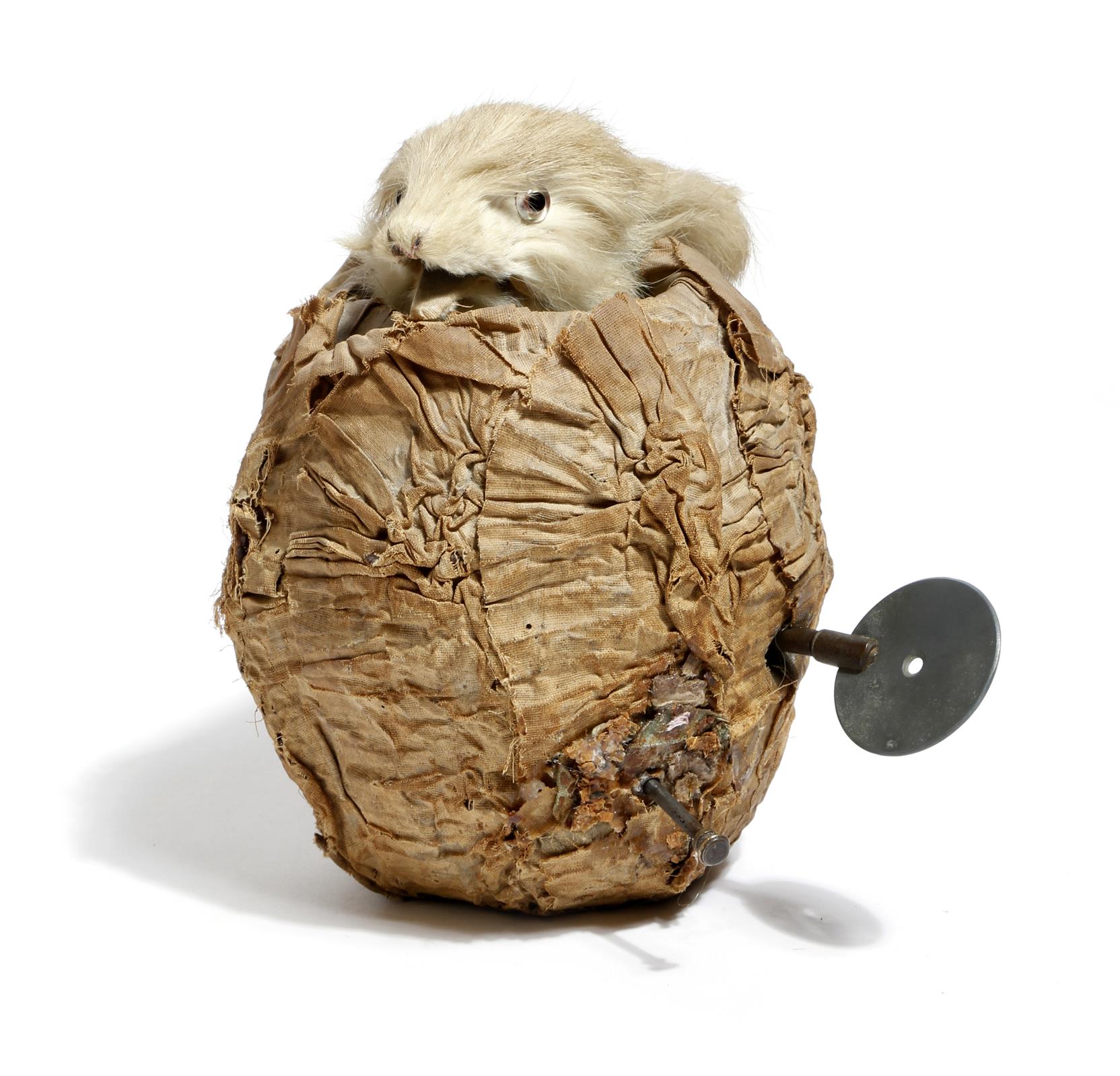 A French automaton toy of a rabbit in a cabbage attributed to Roullet and Decamps, the wind-up spring movement playing one air and driving the rabbit with glass eyes to rise from the centre of the cabbage, moving its ears and opening its mouth and retreating, late 19th century, 18cm high.