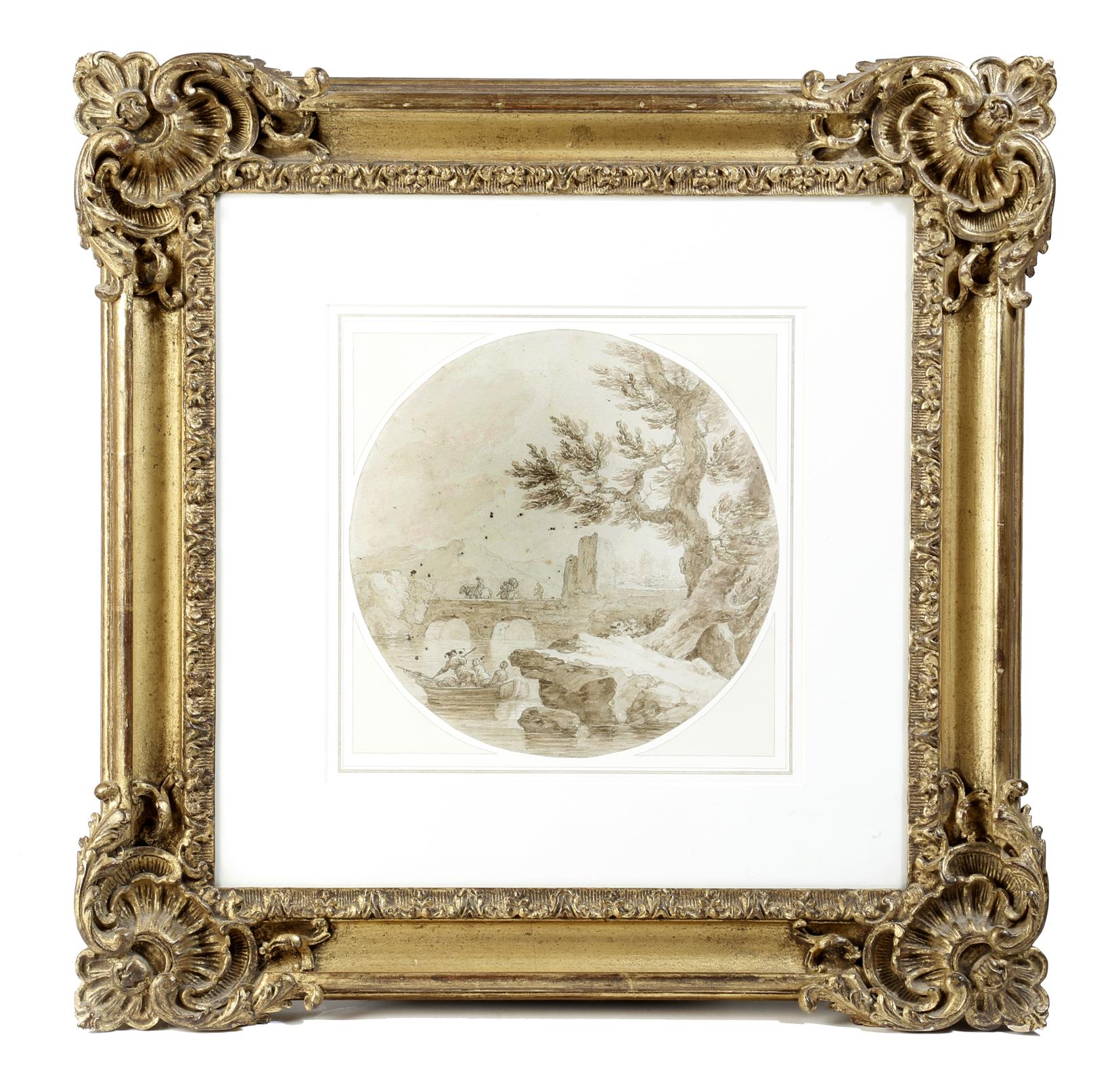 French School 19th Century River landscape with rustics in a boat and on a bridge Sepia washes...
