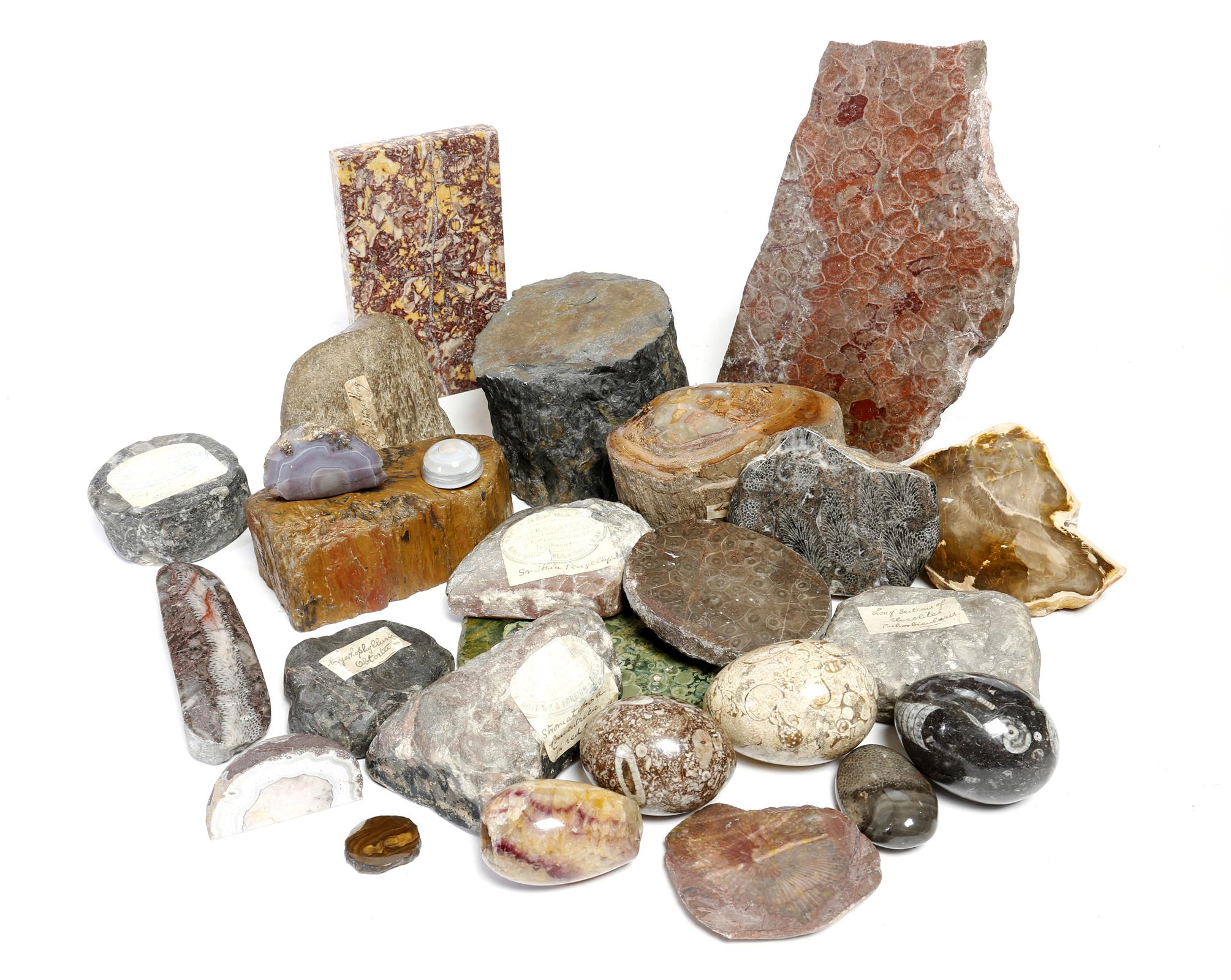 A collection of mineral fossils and hardstone specimens, including: blue john, Moroccan cuttlefish fossil egg, agate, corals, stromatopora concentrica, branching heather in madrepose and other specimens, some with labels for 'A. J. R. SOLATER DEALER IN MINERALS, FOSSILS, BRITISH & FOREIGN SHELLS, 43, NORTHUMBERLAND PL. TEIGNMOUTH', 22cm (max). (26)