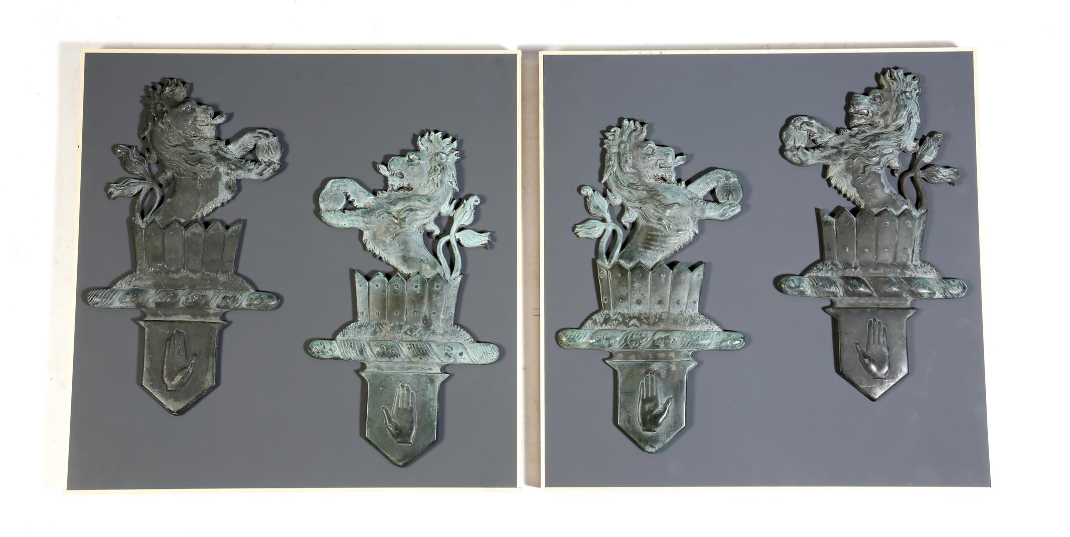Two pairs of bronze gatepost finials, each in the form of a rampant lion crest, issuing from a crown above an open hand, probably 19th century, 46.3 x 26.1cm, mounted on later panels. (2)