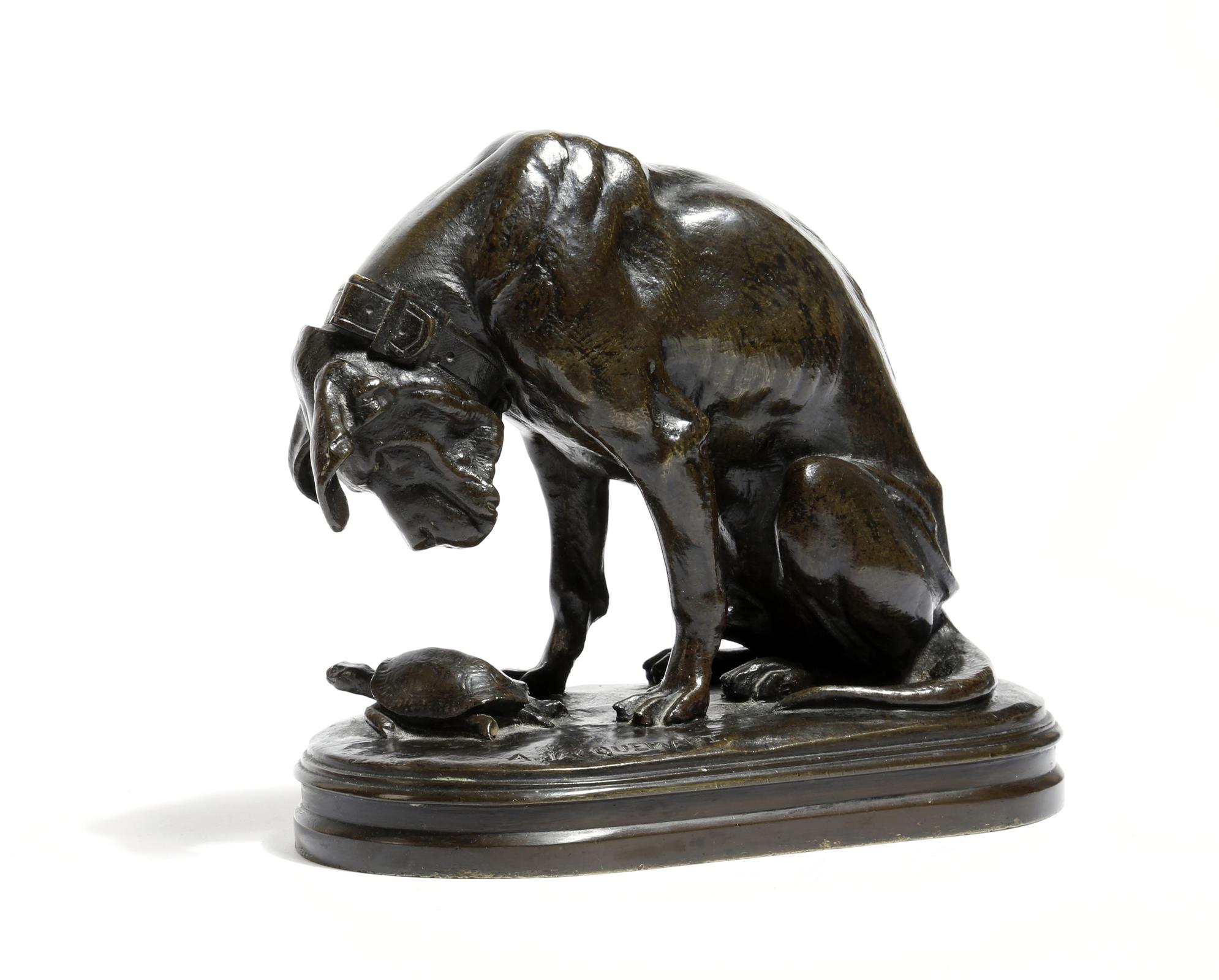 Henri Alfred Marie Jacquemart (French 1824-1896). A 19th century bronze group of a hound dog studying a tortoise, signed 'A. Jacquemart', 15.3cm high, 18cm wide.
