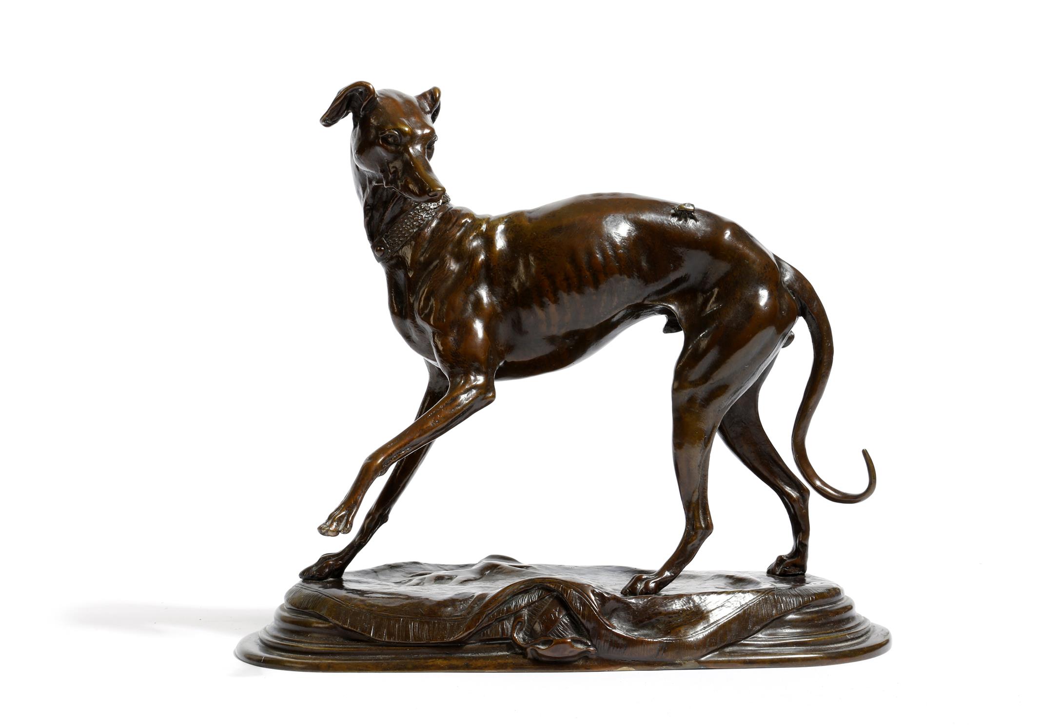 After Alfred Barye (French 1839-1882). A bronze model of a whippet and a fly, titled 'FOY', the draped base signed 'A. BARYE F', 27cm high, 30.8cm wide. Base with initials 'F B L' for Fonderie de Bronze Lauragaise, CIRE PERDUE BRONZE.