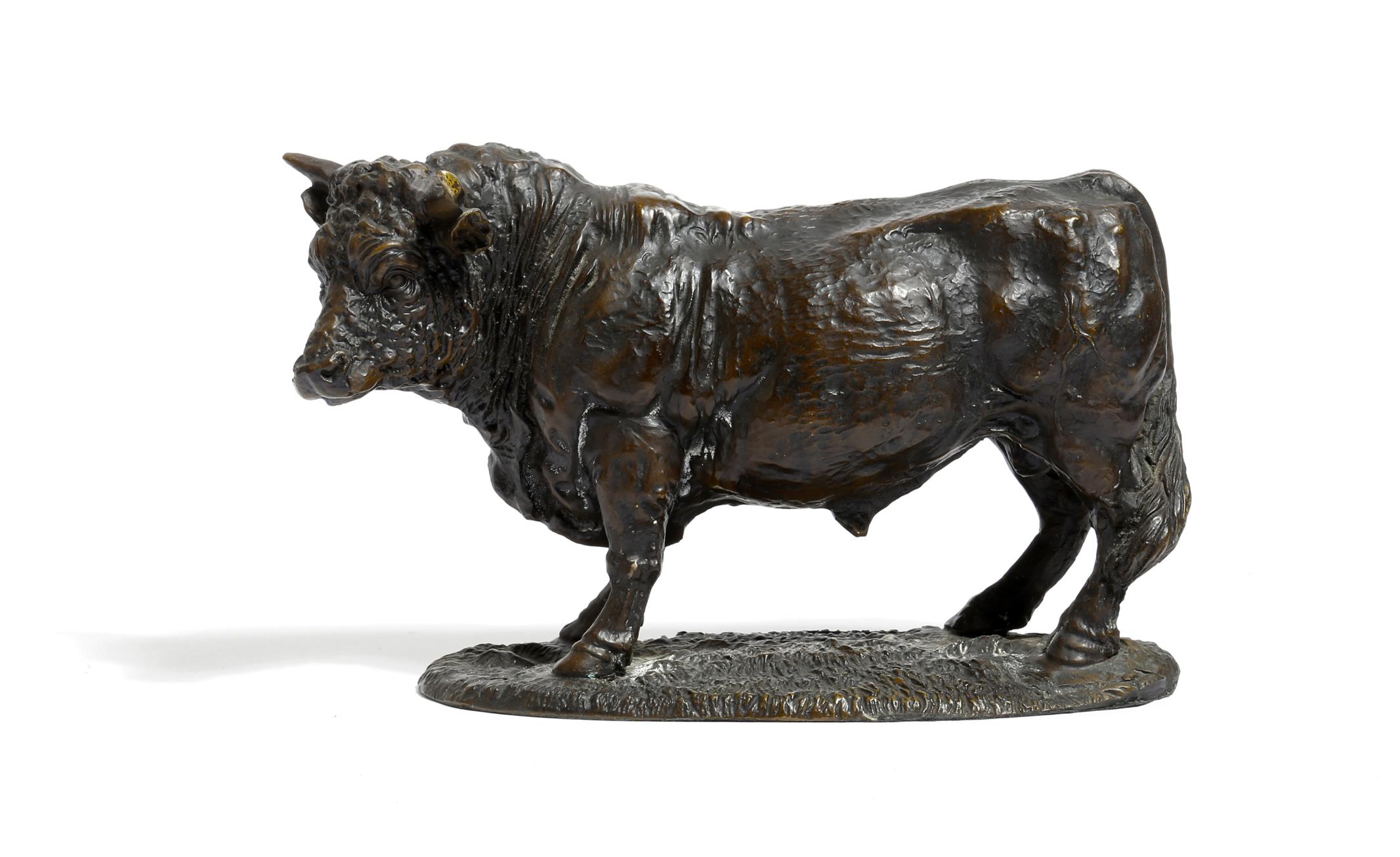 A bronze model of a bull, standing on a naturalistic oval base, with inscription 'P. E. T. COLLECTOR P. EDITION', 14.9cm high, 24cm long.