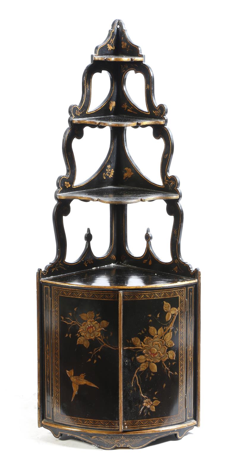 A japanned hanging corner cabinet, with gilt decoration, with three shelves above a cupboard, first half 20th century, 94.3cm high, 38.2cm wide, 26.5cm deep.