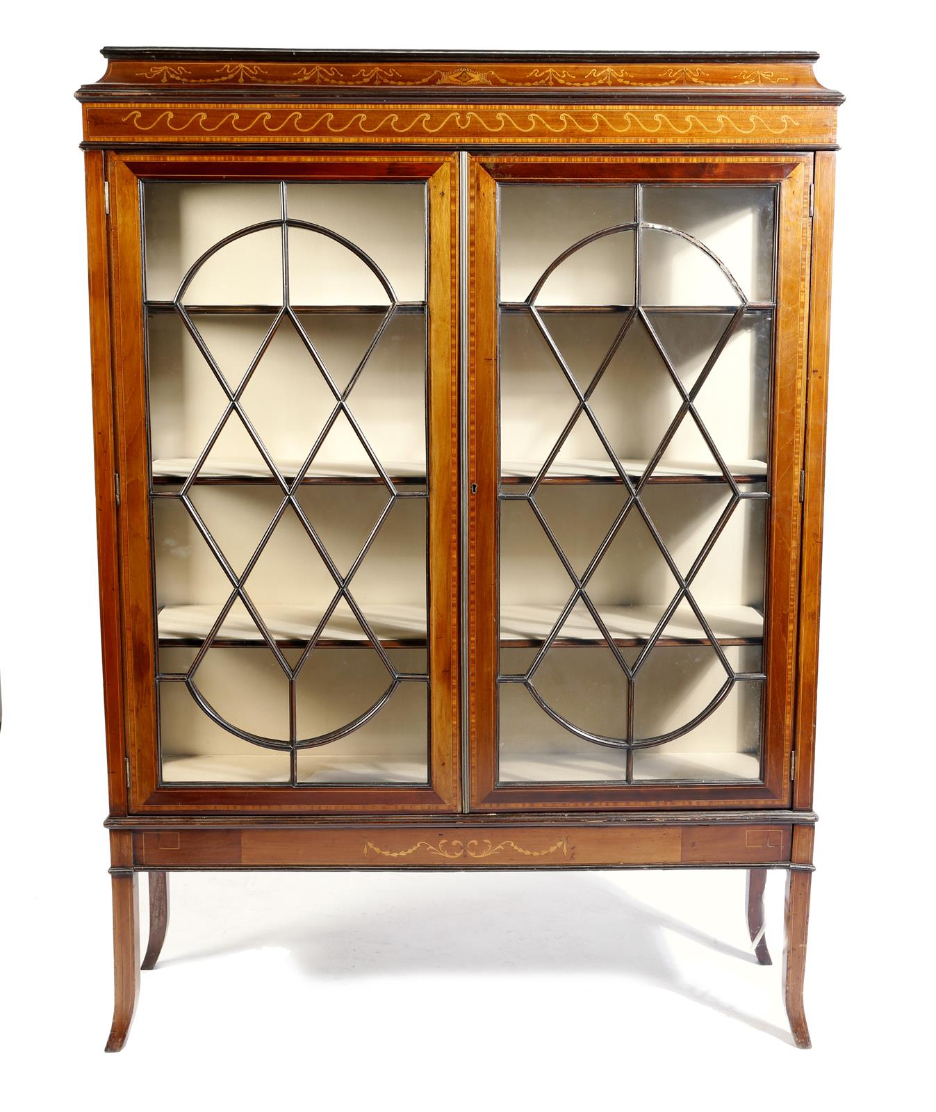 An Edwardian mahogany and marquetry display cabinet, with satinwood banding and inlaid with ribbon tied husk swags and a Vitruvian scroll, with a pair of astragal glazed doors enclosing three shelves, 170.9cm high, 124.5cm wide, 37.2cm deep