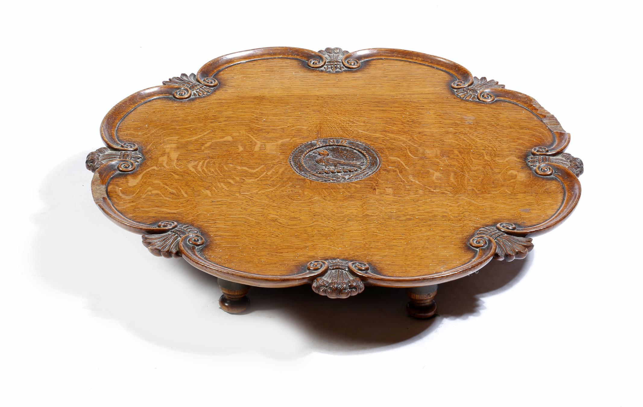 An early Victorian oak lazy Susan, the revolving top with a scroll carved edge interspersed with plumes of feathers and sheaves of wheat, the centre with a bird crest and initials 'GNB', 11cm high, 61cm diameter.