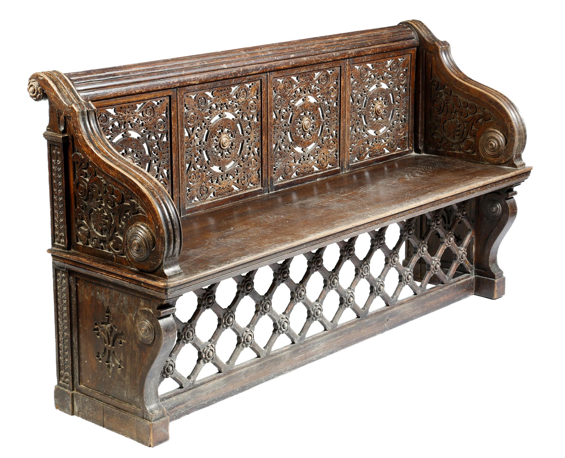 A Victorian carved oak and pine hall seat in the manner of Richard Bridgens, with a quadruple fretwork panelled back with fluted scroll arms, with blind fret carved panels, above a conforming base, with a lattice panel carved with rosettes, with traces of painted highlights, 91cm high, 164.5cm wide, 51.5cm deep.